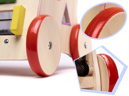 Kolorowe elementy przyciagają wzrok i małe rączki kolorami. Jednocześnie, dzięki neutralnej, drewnianej bazie, zabawka nie dostarcza dziecku nadmiaru bodźców.