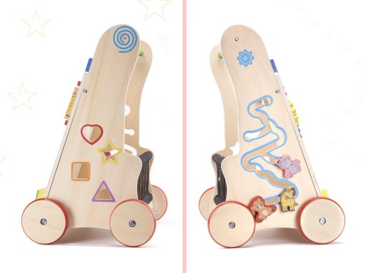 Chodzik, który ułatwi Twojemu maluchowi stawianie pierwszych kroków. Sprawdzi się też w późniejszym wieku jako wózek dla ulubionych zabawek oraz pierwsze liczydło.Spacer z pchaczem pomaga maluchowi utrzymać równowagę podczas nauki chodzenia. Wspomaga rozwój zdolności manualnych oraz rozwija motorykę całego ciała. Chodzik zachęci malucha do aktywności fizycznej.Nasz chodzik jest stabilnym wsparciem dla malucha, który uczy się chodzić. Dziecku nie uda się go przewrócić. Drewniane koła zabezpieczono antypoślizgową warstwą gumy.Cieszy funkcjonalnością i cieszy oko. Estetyczna konstrukcja, wyraziste kolory, dbałość o detale - to ładny i bezpieczny towarzysz dla Twojego dziecka. Ten pchacz spodoba się rodzicom, którzy poszukują ekologicznychakcesoriów dla swojego malucha. Drewniane zabawki to świetny wybór!