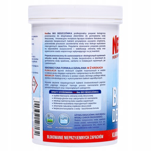 NeoBac BIO DESZCZÓWKA profesjonalny preparat biologiczny przeznaczony do eksploatacji zbiorników do gromadzenia wody deszczowej. Innowacyjna receptura łącząca działanie flokulantu oraz aktywności bezpiecznych bakterii przyspiesza usuwanie zmętnienia, przeciwdziała procesowi zazielenienia wody oraz blokuje wydzielanie nieprzyjemnych zapachów.