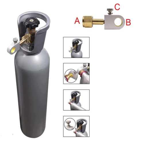 Uwagi - 1. Włóż pustą butelkę wieczorem do lodówki, aby uzyskać lepsze wyniki napełniania. Potrzebujesz rękawicy do trzymania zimnego cylindra; 2. Nasz adapter do napełniania butli CO2 nadaje się tylko do napełniania butli Co2 o pojemności 60 litrów (różowy, bezgwintowy). Potwierdź, że twój cylinder jest prawidłowy. 3. Jeśli twój duży zbiornik Co2 nie ma syfonu, przed napełnieniem odwróć go do góry nogami.