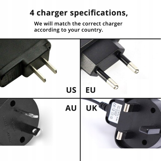 4 rodzaje specyfikacji ładowarek, wybierzemy odpowiednią ładowarkę w zależności od kraju. Ponieważ jest to wybór ręczny, nieuniknione jest, że nastąpi błędna ocena. Mam nadzieję, że możesz nam powiedzieć, jakiej specyfikacji ładowarki potrzebujesz w wiadomości o zamówieniu. Dziękuję.