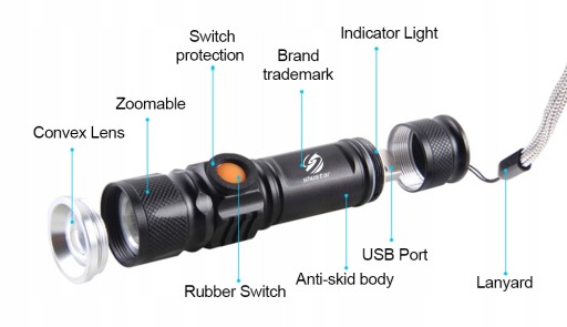 Pakowanie: mini latarka Q5 jest mniejsza niż T6 i lżejsza. Ale pojemność baterii T6 jest większa niż Q5, a odległość oświetlenia jest większa niż Q5.
