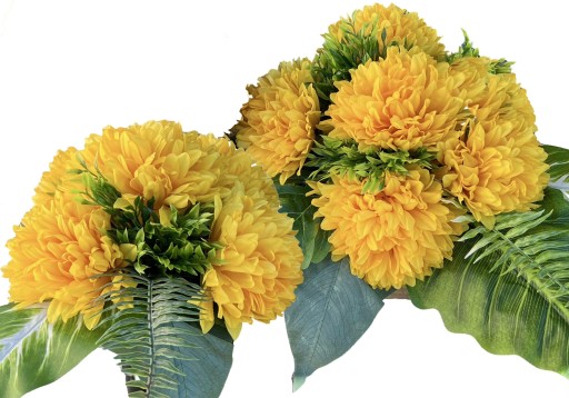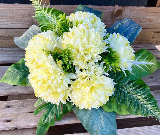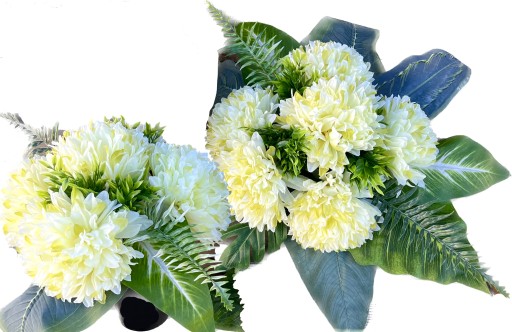 W skład wiązanki i bukietu wchodzi zestaw sztucznych chryzantem w kilku wersjach kolorystycznych.