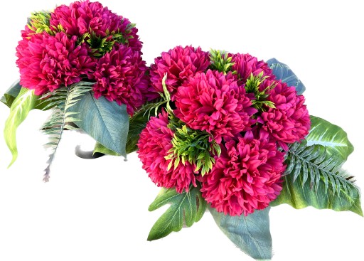 W skład wiązanki i bukietu wchodzi zestaw sztucznych chryzantem w kilku wersjach kolorystycznych.
