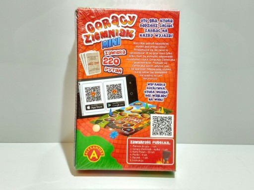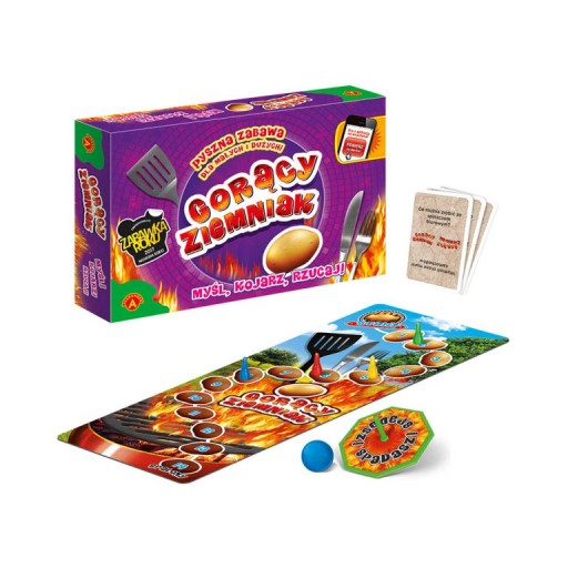 plansza, Gorący Ziemniak (w postaci kulki), 110 kart pytań, 4 pionki, bączek, instrukcja.