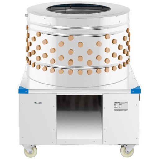 Bezpieczeństwo przerabianego drobiu zapewnia 211 wypustek z naturalnej gumy. Dbają one o to, aby przy skubaniu z prędkością 275 obrotów na minutę żaden element skóry nie został uszkodzony. Sprzęt ma cztery kółka, które można zabezpieczyć dwoma hamulcami. Dzięki temu masz pewność, że konstrukcja nie poruszy się podczas pracy.