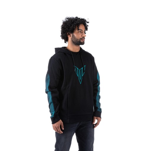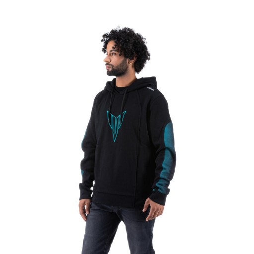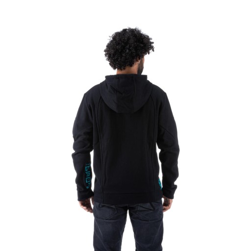 Elegancka i pasująca na miejskie ulice męska kurtka z kapturem Hyper Naked w matowej czerni (stealth black) z zadziwiającymi niebiesko-zielonymi akcentami nawiązującymi do nowych motocykli z serii MT. Ta kurtka z kapturem, wykonana z organicznej bawełny i pochodzącego z recyklingu poliestru oferuje maksymalny komfort. Duży panel z przodu z nadrukowanym logo MT, to ukłon w stronę fanów naked bike'ów Yamahy. Wyblakłe niebieskie grafiki na rękawie oraz logotypy 3D DSOJ (Dark Side Of Japan) na wewnętrznej części rękawu i z boku wprowadzają dynamikę do wyglądu. Kaptur z podszewką zapewnia ochronę przed złą pogodą, a kieszeń typu kangur oferuje przestrzeń na wszystko co lubisz mieć przy sobie. Podstawowy element odzieży dla miejskiego eksplorera.