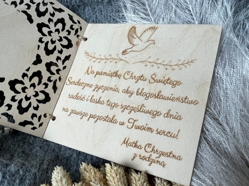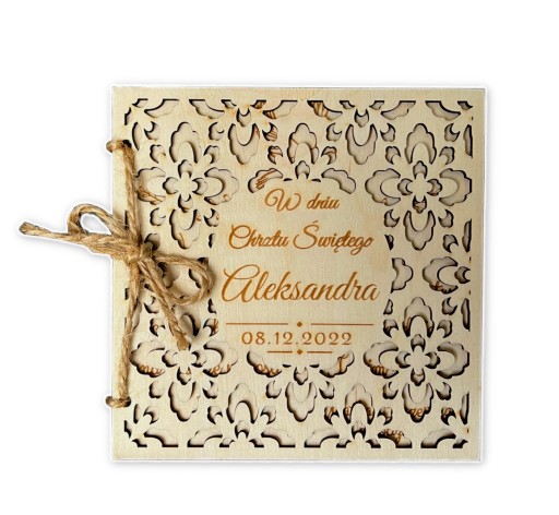 Wykonana z należytą starannością i dbałością o każdy szczegół. Wewnątrz znajduje się kartka grawerowana laserowo z życzeniami spersonalizowana przez Państwa lub z gotowego projektu tj.: