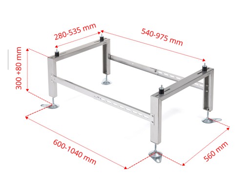 Wysokość całkowita wynosi 300 mm, a dzięki stopom o wysokości 90 mm, masz pewność stabilności. Konstrukcja ma szerokość 560 mm i długość od 600 do 1040 mm, a nośność wynosi aż 500 kg (według testów materiałowych nawet do 700 kg).