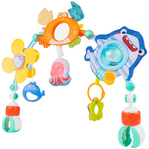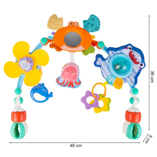 Pałąk do łóżeczka/wózka Morskie Stworzenia Dla fanów podmorskich przygód przedstawiamy kolorowy pałąk ze zwierzątkami morskimi. Nasz produkt idealnie nadaje się do wózka, fotelika, leżaczka, krzesełka oraz łóżeczka i zaciekawi każdego malucha. Sposób montażu jest bardzo szybki i prosty! Pałąk posiada specjalne zatrzaski, za pomocą których można nadać mu odpowiedni kształt, dostosowany do naszych potrzeb. Na obu końcach znajdują się regulowane zaczepy, którymi możemy przymocować pałąk do łóżeczka/wózka itp.