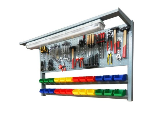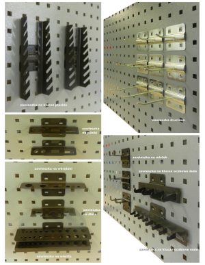 - wyposażona w ściankę perforowaną (perforacja kwadratowa) oraz dwa wsporniki do zawieszania pojemników na drobne elementy, każdy wspornik posiada 12 gniazd na pojemniki,