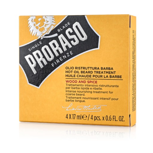 PRORASO Beard Hot Oil Treatment z serii Wood & Spice to zestaw czterech mocno skoncentrowanych olejków do brody, które zmiękczą włosy i pozostawią je kompleksowo nawilżone.