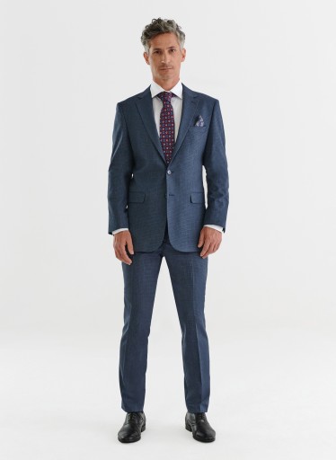 Męski klasyczny granatowy garnitur w pepitkę od Pako Lorente. Marynarka o kroju Slim Fit. Taliowany fason oraz jednorzędowe zapięcie podkreślają męską sylwetkę. Lekko zwężane, zaprasowane w kant nogawki nadają eleganckiego wyglądu. Tkanina dzięki sztucznym włóknom jest wytrzymała, sprężysta i odporna na zużycie. Dodatek elastanu pozwala na lepsze dopasowanie do sylwetki, natomiast wiskoza jest przyjemna w dotyku. Garnitur idealny na większe wyjścia, wesele, czy komunię. Noszone oddzielnie, znakomicie sprawdzą się w bardziej codziennych stylizacjach. Marynarka do jeansów, czy spodnie z gładką koszulą idealnie sprawdzą się do pracy, czy na kolację w restauracji.