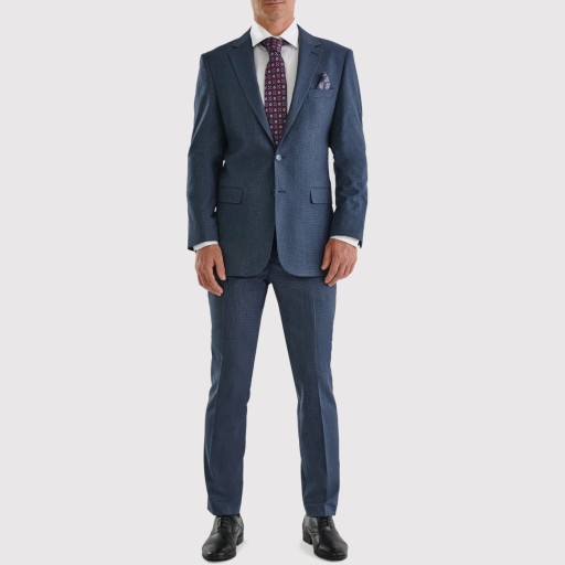 Męski klasyczny granatowy garnitur w pepitkę od Pako Lorente. Marynarka o kroju Slim Fit. Taliowany fason oraz jednorzędowe zapięcie podkreślają męską sylwetkę. Lekko zwężane, zaprasowane w kant nogawki nadają eleganckiego wyglądu. Tkanina dzięki sztucznym włóknom jest wytrzymała, sprężysta i odporna na zużycie. Dodatek elastanu pozwala na lepsze dopasowanie do sylwetki, natomiast wiskoza jest przyjemna w dotyku. Garnitur idealny na większe wyjścia, wesele, czy komunię. Noszone oddzielnie, znakomicie sprawdzą się w bardziej codziennych stylizacjach. Marynarka do jeansów, czy spodnie z gładką koszulą idealnie sprawdzą się do pracy, czy na kolację w restauracji.