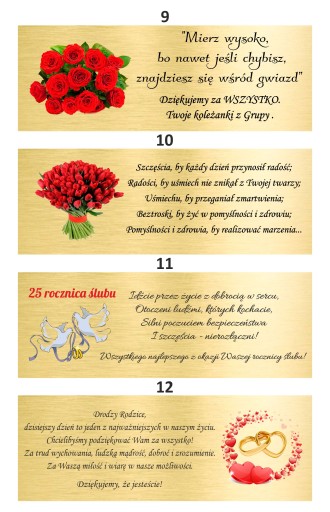 (można skorzystać z naszych propozycji lub podać swój własny tekst i grafikę, jeżeli chcą Państwo użyć swojej grafiki należy ją najpierw do nas wysłać w wiadomości, a my sprawdzimy czy się nadaję do umieszczenia na tabliczce)