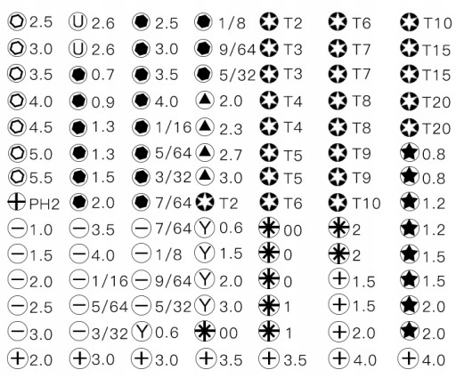 - 14 nasadek płaskich Flathead: 1.0, 1.5, 2.0, 2.5, 3.0, 3.5, 4.0, 1/16, 5/64, 3/32, 7/64, 1/8, 9/64, 5/32,