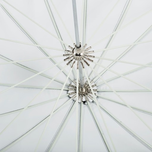 Wewnętrzna powierzchnia Quadralite Deep Space 165 pokryta jest mlecznobiałym materiałem z matowym wykończeniem, które odbija światło, nadając mu bardzo delikatny charakter. Ponadto duża powierzchnia parasola składająca się z 16 elementów powoduje, że fotografowany obiekt będzie oświetlony niezwykle miękko, a cienie lekko zarysowane. Stelaż wykonany z włókna szklanego składa się z aż 16 ramion, co sprawia, że materiał jest równomiernie napięty, a parasol utrzymuje swój kształt. Zastosowanie włókna szklanego gwarantuje też dużą żywotność parasola i jego wysokie walory użytkowe. Sztyca parasola została wykonana z metalu i umożliwia wygodny montaż do każdej lampy studyjnej marki Quadralite.