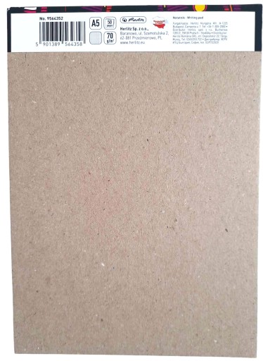 Zeszyt A5. 50 kartek w kratkę. Papier 70 g/m2. Podręczny format. Uszlachetnienie okładki: lakier dyspersyjny połysk. Liniatura: niebieska. Klejenie po któtszym boku.