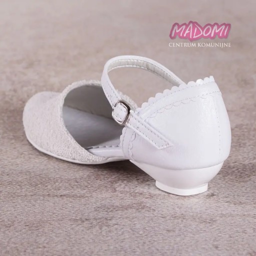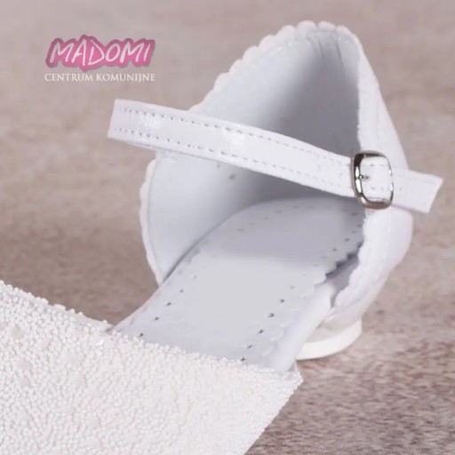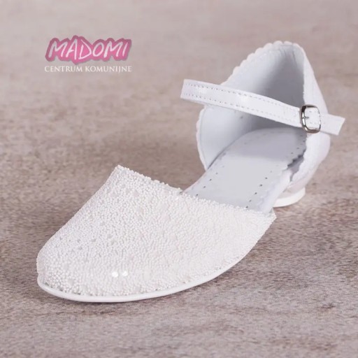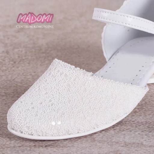 Prezentujemy Państwu wyjątkowo modne buty komunijne dla dziewczynki Polskiego Producenta obuwia firmy MIKO. Przód tych butów pokryty jest materiałem wykonanym z małych kuleczek w kolorze białym. Efekt uzyskany sprawia że bardzo się wyróżniają i przyciągają wzrok. Buty komunijne które prezentujemy posiadają mały obcas i regulowany pasek który będzie pewnie trzymał but na nodze.