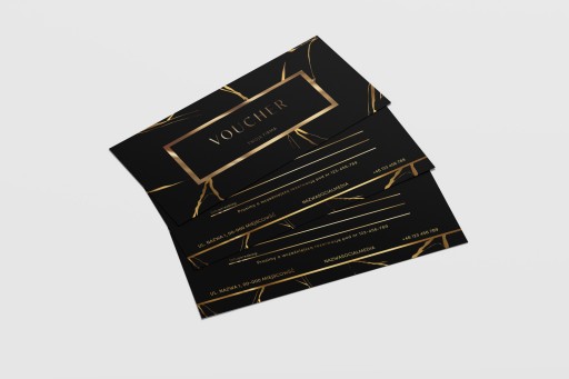 Voucher podarunkowy, zaproszenie na wizytę czy zabieg. Elegancki projekt w czerni i złocie, tył czarny lub z białym środkiem