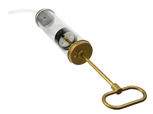 - Wciśnij rączkę: Przytrzymując odsysarkę-strzykawkę za rączkę, wciśnij ją, aby wytworzyć próżnię wewnątrz narzędzia. Utrzymuj rączkę wciśniętą, gdy wężyk jest wewnątrz układu, aby uniknąć cofnięcia się płynu.
