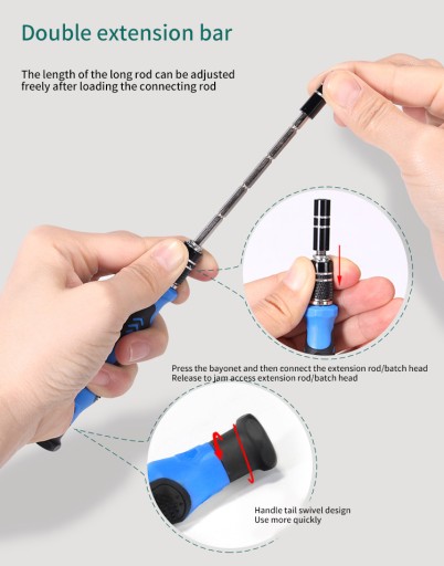 - Wkrętak BAZA (rączka powlekana gumą - antypoślizgowa) - do niego podłączasz bity. UWAGA! W środku znajduje się regulowana przedłużka