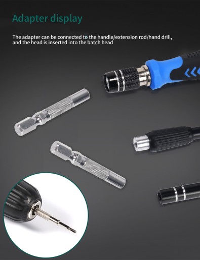 - 7 sztuk bitów z końcówką nasadową: 1x 2.5, 1x 2.0, 1x 3.5, 1x 4.0, 1x 4.5, 1x 5.0, 1x 5.5