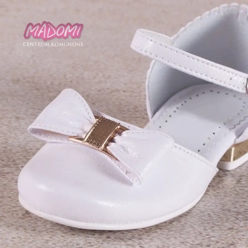Bardzo eleganckie obuwie komunijne Polskiego Producenta obuwia firmy MIKO, wykonane ze skórki ekologicznej, wkładka i zapiętek ze skórki naturalnej. Na szerokim białym obcasie z wstawkami w kolorze złotym. Zapinane po bokach na regulowany paseczek dzięki czemu pewnie trzymają się na stopie.