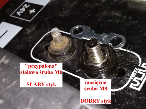 Montaż bezpiecznika w oprawce wymaga powiększenia otworu w bezpieczniku blaszkowym CLASS ( fabrycznie ma otwór 6,5mm) do średnicy 7,2mm. Te oprawki wytrzymują spokojnie prąd rozruchowy dzięki dobremu stykowi i mosiężnej śrubie prądowej ! Fotka ostatnia to porównanie "przypalonej" oryginalnej STALOWEJ śruby M6 i MOSIĘŻNEJ M8. Oprawki pasują bez przeróbek do większych rozruchów z bezpiecznikami 200-500A, np serii 840 (Magnum, Ripper itp) które są oparte na śrubie M8. Cena 28zł/szt. Kupując bezpiecznik/i można zrobić dopłatę przez PayU, można też dopłacić zwykłym przelewem na konto bankowe firmy.