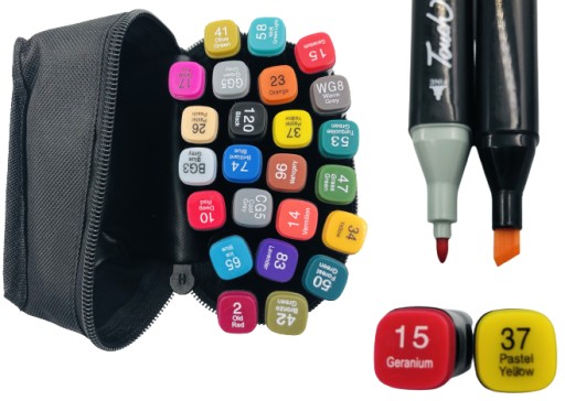 Zestaw 24 markerów dwustronnych w materiałowym opakowaniu.