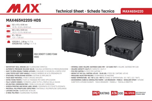 Walizka hermetyczna Max Cases do transportowania delikatnych przedmiotów w trudnych warunkach, dzięki wykorzystaniu wysokiej jakości materiałów oraz przemyślanej budowie walizki są wodoodporne, pyłoodporne oraz posiadają dużą tolerancję na uszkodzenia mechaniczne. Walizka posiada pełne wypełnienie piankowe które możemy dostosować do przechowywanego przedmiotu, jakość produktu potwierdza szereg certyfikatów takich jak: STANAG 4280 i DEF STAN 81-41 oraz posiadają kodowanie NATO (NSN) i Certyfikaty IP67, ATA300 i wojskowe. Są to walizki najwyższej jakości które sprawdzą się wszędzie tam gdzie tylko możemy je zabrać wojsko, policja, nurkowanie, różne sporty ekstremalne nie są obce temu produktowi.