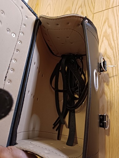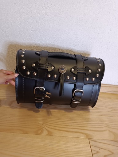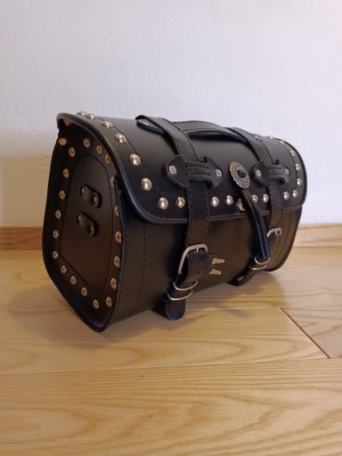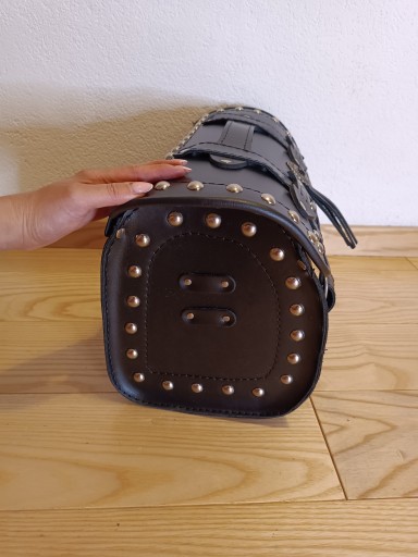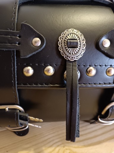 Kufer centralny skórzany wykonany ze skóry bydlęcej produkcja europa nie tani zamiennik z chin, z ćwiekami dedykowany do motocykli typu chopper cruiser. ZAMEK i zdobienia