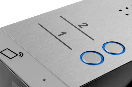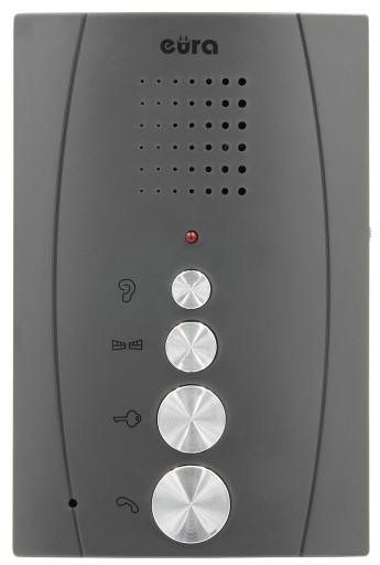 Domofon dwurodzinny - Eura ADP-62A3, wyposażony jest w dwa grafitowe unifony głośnomówiące, kasetę zewnętrzną ze wbudowanym czytnikiem kluczy zbliżeniowych, oraz komplet zasilaczy sieciowych 12V DC. Unifon bezsłuchawkowy ADA-12A3 posiada funkcję obsługi dwóch wejść, tym samym umożliwia otwierania furtki oraz np. bramy. Ponadto wyposażony jest w przycisk dyskretnego podsłuchu otoczenia kasety zewnętrznej i regulację głośności rozmowy. Dwulokatorska kaseta zewnętrzna ADA-62A3 domofonu przeznaczona jest do montażu natynkowego. Wykonana ze stopu aluminium i zabezpieczona dodatkowym daszkiem gwarantuje odporność na niekorzystne warunki atmosferyczne. Wejście na posesje może być realizowane za pomocą czytnika zbliżeniowego obsługującego breloki i karty pracującego w standardzie Unique RFID 125kHz.
