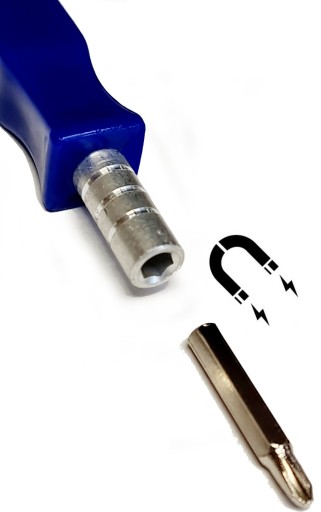 Magnes zamocowany w główce wkrętaka ma podwójne zastosowanie:przede wszystkim mocuje przyciągając metalowe bity, ale również przyciąga śrubki które aktualnie wkręcamy/wykręcamy ułatwiając pracę śrubokrętem.