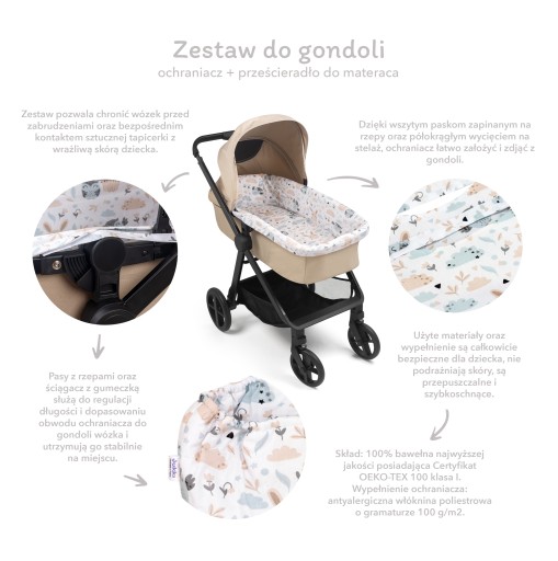 - Dzięki wszytym paskom zapinanym na rzepy oraz półokrągłym wycięciem na stelaż, ochraniacz łatwo założyć i zdjąć z gondoli.