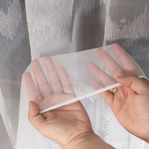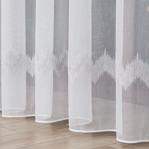 Zachwycająco lekki i zwiewny materiał oraz delikatny haft to zdecydowanie cechy, które wyróżniają tę firanę. Biała firana haftowana z błyszczącym geometrycznym wzorem w szarym kolorze, umieszczonym w dolnej części dekoracji dodaje całości uroku, natomiast dół firany posiada ołowiankę, która świetnie dociąża całość. Materiał firany wpuści do wnętrza dużą ilość promieni słonecznych, zachowując tym samym Twoją prywatność. Wysokość dekoracji daje możliwość na zawieszenie jej w eleganckim salonie czy sypialni w stylu glamour.