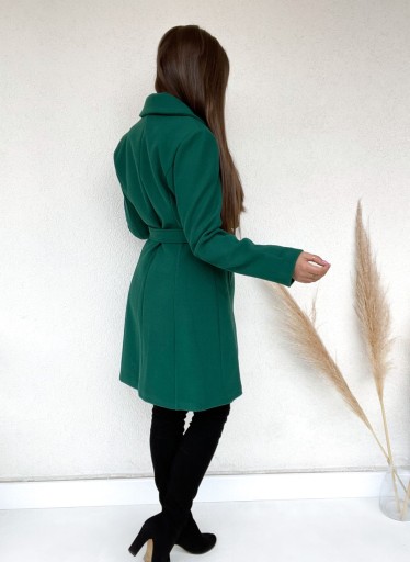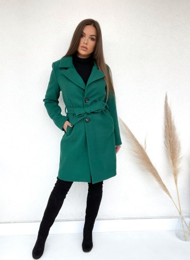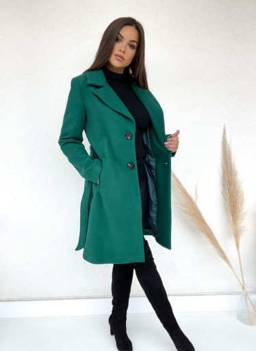 Płaszczyk posiada dwie głębokie kieszenie, piękne wykończenie, zapinany jest na dwa guziki oraz przewiązywany paskiem.