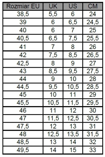 Połóż na podłodze kartkę papieru tak, by jeden jej brzeg przylegał do ściany. Stań na papierze z piętą przy ścianie. Zaznacz ołówkiem miejsce, w którym kończą się Twoje palce. Zmierz na papierze odległość między ścianą, a zaznaczonym przez Ciebie miejscem, a następnie porównaj tę długość z długością w naszej tabeli rozmiarów.