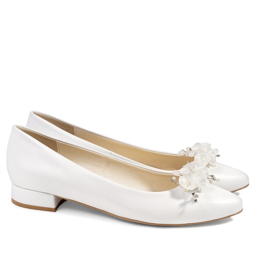 Ślubne licowe balerinki z ozdobą z perełek i kwiatów Clarisa białe