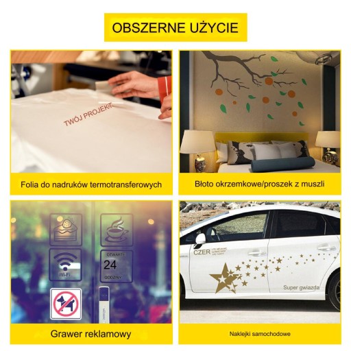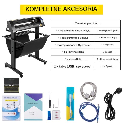 Ploter do wycinania znaków zawiera kompletne akcesoria dla lepszego wykorzystania, takie jak pamięć USB wraz z instrukcją instalacji i obsługi, 5 arkuszy winylowych, matę do cięcia i wymienne ostrza. Oferuje również bezpiecznik posiadający funkcję zatrzymania awaryjnego, aby zapobiec niebezpiecznym sytuacjom.