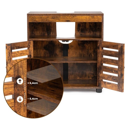 Szafka łazienkowa wykonana z płyty wiórowej laminowanej dedykowana pod umywalkę estetycznie wypełni wnętrze łazienki nadając jej całkowity rustykalny akcent. Dodatkowo regulowane półki we wnętrzu szafki pomogą uporządkować najpotrzebniejsze rzeczy znajdujące się w łazience według własnych potrzeb. Rozmiar otworu na syfon wynosi 20 x 15 cm, a całkowite obciążenie szafki utrzyma do 20 kg , który zagwarantuje korzystanie z mebla na długie lata.