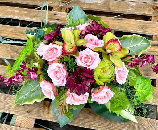 Wiązanka przygotowana jest w plastikowej, obciążonej betonem misie do postawienia na nagrobku. Wiązanka jest stabilna. Bukietprzygotowany jest w tubie do włożenia do wazonu docelowego. Nie jest obciążona, gdyż nie ma takiej konieczności.