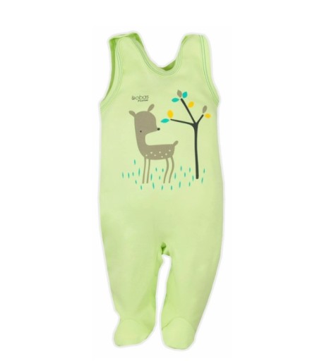 Z przodu śpioszka znajduje się duży obrazek z jelonkiem. Krój umożliwia całkowite rozpięcie, przez co ubranko jest funkcjonalne i wygodne. Śpioch niemowlęcy wykończony jest miękką lamówką.