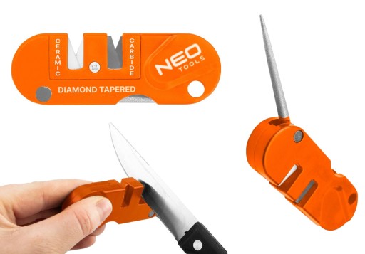 Ostrzałka do noży, kieszonkowa 56-054 NEO to uniwersalne i poręczne narzędzie, które z powodzeniem przywróci ostrość noży za pomocą dwóch stopni ostrzenia – wstępnego i nadającego kształt oraz ostatecznego. Pierwsze odbywa się za pośrednictwem węglika wolframu wyrównującego powierzchnię oraz kształtującego ostrze, a finalne ceramiczne – wygładza i poleruje materiał. Ostrzałka posiada również pręt do ostrzenia ząbkowanych ostrzy. Produkt został wykonany z odpornego tworzywa ABS i częściowo pokryty gumą TPR, wpływającą na wygodę użytkowania oraz pewny chwyt. Ergonomiczny kształt rękojeści ułatwia ostrzenie, a kompaktowy rozmiar zabranie ze sobą np. w survivalową podróż.