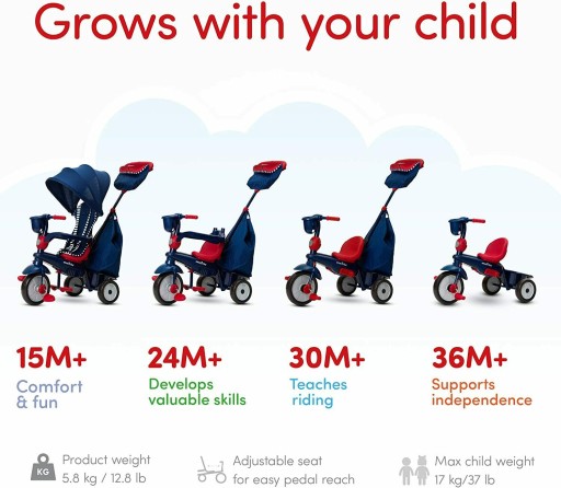 Dzięki Smart Trike 4 w 1 dla malucha nie tylko zapewnisz dziecku przyjemną, wygodną jazdę. Dostajesz też zabawkę, która pod koniec stanie się pełnoprawnym trójkołowcem. Pokochają to! To rosnący wózek dla dzieci! Idealny dla dzieci w wieku od 15 do 36 miesięcy, ten wytrzymały trójkołowy rower dla dzieci zapewnia frajdę przez wiele lat. Przekaż to rodzeństwu, a otrzymasz zabawkę, która przetrwa pokolenia.