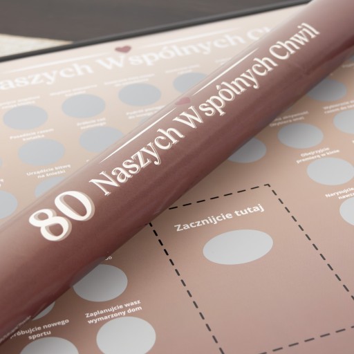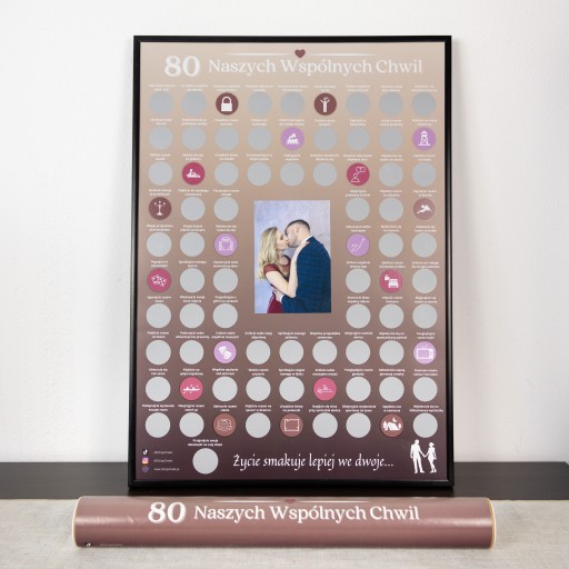 Plakat zdrapka dla par od Zdrap Chwile to więcej niż jeden prezent, to aż 80 pomysłów na niezapomnianą randkę, których po po prostu musicie wspólnie doświadczyć. Idealny prezent na każdą okazję z możliwością wklejenia wspólnego zdjęcia. Zdrapujcie zadania, które już zrealizowaliście. Pomoże Wam to zauważyć jaki postęp już zrobiliście oraz jak wiele wspólnych, a także różnorodnych wspomnień zbudowaliście.