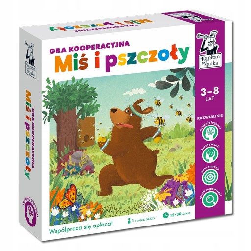 Miś i pszczoły to gra kooperacyjna dla przedszkolaków, w której uczą się pracy zespołowej i rozwiązywania problemów. Dzieci wcielają się w rolę pracowitych pszczółek i starają się jak najszybciej zamienić kwiatowy nektar w plastry miodu. Muszą zdążyć, zanim wyprzedzi je łakomy miś sprinter!Pszczołom nie jest obojętne, z którego kwiatu czerpią nektar, dlatego gracze ćwiczą podczas rozgrywek umiejętność rozpoznawania kolorów, myślenia strategicznego oraz przewidywania konsekwencji własnych działań. Zakręćcie kołem losującym, które wskaże drogę nie tylko wam, ale również dowiecie się którędy podąży miś.