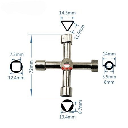 Uniwersalny klucz do szafek technicznych, elektrycznych, sterowniczych z 4 różnymi końcówkami. Przeznaczony do skrzynek gazomierzy, wodomierzy, liczników prądu elektrycznego, podzespołów klimatyzacyjnych, zaworów odcinających, konsoli sieciowych itp.