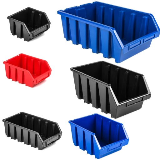 Pojemniki wyposażone są w specjalne haczyki na tylnej ścianie umożliwiające zawieszenie ich na relingu lub półce warsztatowej. Jeśli nie chcesz ich wieszać, możesz położyć je jeden na drugim. Zajmują mniej miejsca i tworzą stabilną konstrukcję.