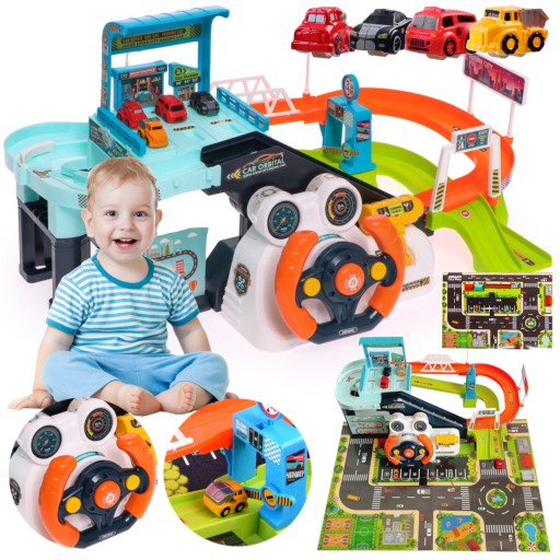 Genialny zestaw motoryzacyjny, w którym zabawa polega na poprowadzeniu autek przez cały tor, wyjazd windą oraz kierowanie kierownicą z dźwiękami.